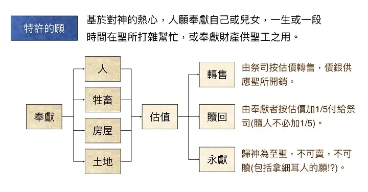 (1) 许愿奉献的人 ── 许愿奉献的人,要经过神的估价,各人按年龄与性别,估价不相同。