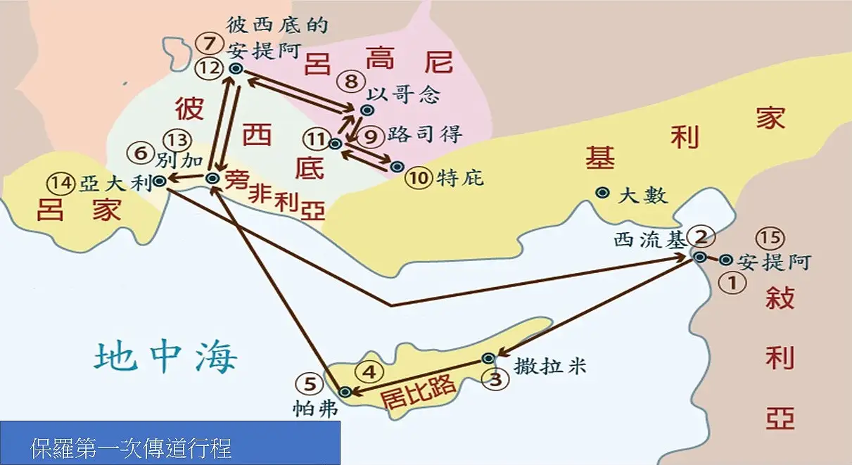 敘利亞的安提阿➜西流基➜撒拉米➜帕弗➜別加➜彼西底省的安提阿➜以哥念➜路司得➜特庇➜路司得➜以哥念➜彼西底省的安提阿➜別加➜亞大利➜敘利亞的安提阿。 點擊看大圖 上圖路線說明: