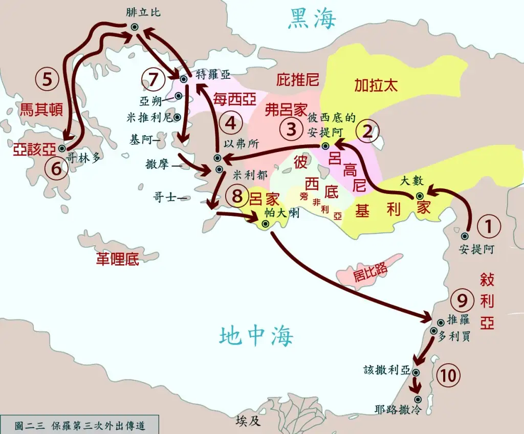 保羅第三次工作的行程是:經過加拉太省和弗呂家省➜以弗所➜馬其頓省➜希臘省➜腓立比➜特羅亞➜亞朔➜米推利尼➜撒摩➜米利都➜哥士➜羅底➜帕大喇➜推羅➜多利買➜該撒利亞➜耶路撒冷。