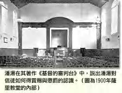 以下是《基督的審判台》的摘錄,說出潘湯對信徒如何得賞賜與懲罰的認識。千年國,就是從主耶穌的再來開始,一直到新耶路撒冷永世的來臨,將會是一些信徒得賞賜的時候,也會是其他信徒受虧損的時候。在基督的審判台前,每一個信徒都會「在基督的審判台前顯露出來,叫各人按著本身所行的,或善或惡,受到應得的報應。」(林後五10